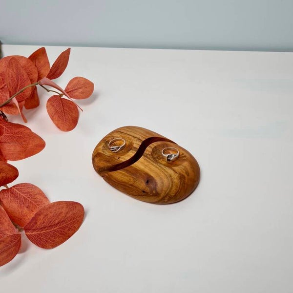 Deze ringenhouder maak ik met de hand van prachtig hout, waardoor de mooiste patronen zichtbaar worden! De houder heeft wat weg van de yin en yang en is vooral geschikt voor (trouw)ringen of oorbellen. Hij is ook erg leuk om te geven als cadeau, bijvoorbeeld voor een bruiloft of verjaardag.