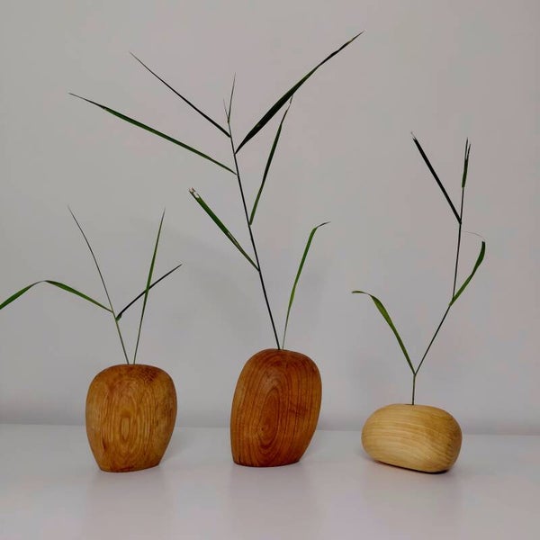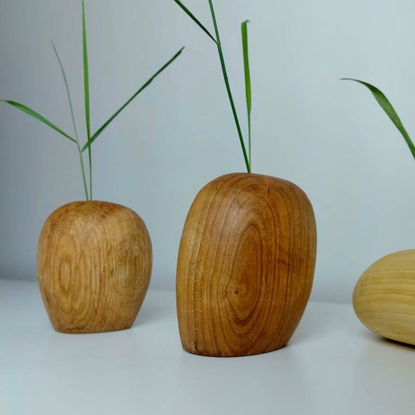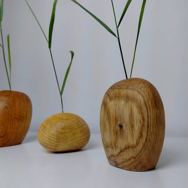 Elk vaasje is gemaakt van een andere houtsoort: vurenhout, Amerikaans kersenhout en eikenhout. Hierdoor ontstaan unieke houtnerven en is ieder vaasje net even anders, samen vormen ze een leuk setje!